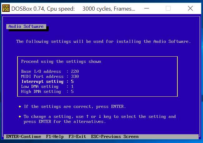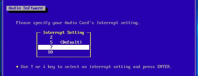 Trên màn hình tiếp theo, chọn giá trị “Cài đặt ngắt: 5” và nhấn Enter. Nó được đặt thành 5 theo mặc định, nhưng mặc định của DOSBox là 7.