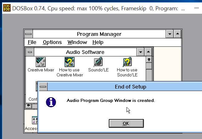 Còn một vấn đề về trình điều khiển nữa cần giải quyết. Windows 3.1 không bao gồm trình điều khiển âm thanh sẽ hoạt động hoàn toàn với phần cứng âm thanh SoundBlaster mà DOSBox đang mô phỏng. Bạn cũng sẽ muốn cài đặt chúng.