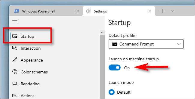 Trong tab Cài đặt, chọn "Khởi động" trong thanh bên. Trên trang Cài đặt khởi động, lật công tắc bên cạnh "Khởi động khởi động máy" cho đến khi nó bật "."