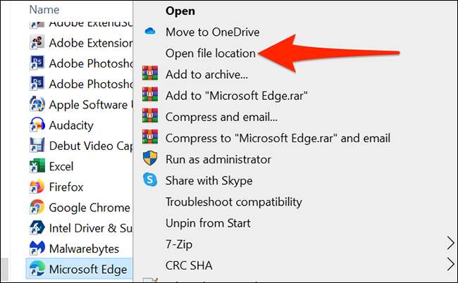 Để bắt đầu, hãy mở menu Bắt đầu và tìm kiếm "Microsoft Edge." Trong kết quả tìm kiếm, nhấp chuột phải vào "Microsoft Edge" và chọn "Mở vị trí tệp."
