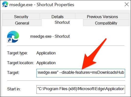 Trong cửa sổ "Thuộc tính", nhấp vào tab "phím tắt". Tiếp theo, nhấp vào hộp "Target", đặt con trỏ sau khi trích dẫn cuối cùng trong hộp và nhấn phím cách.