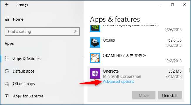 Từ màn hình Cài đặt, bạn có thể đi tới Cài đặt> Ứng dụng> Ứng dụng & Tính năng, nhấp vào ứng dụng và nhấp vào “Tùy chọn nâng cao”.
