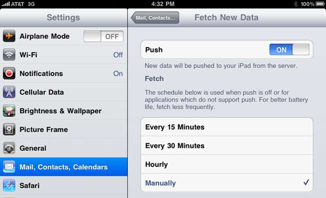 Đi tới Cài đặt -> Thư, Danh bạ, Lịch -> Tìm nạp Dữ liệu Mới và thay đổi cài đặt thành kiểm tra ít thường xuyên nhất có thể. Nếu bạn không sử dụng nó thường xuyên, bạn chỉ có thể tắt Push hoàn toàn và sau đó kiểm tra theo cách thủ công khi bạn cần.