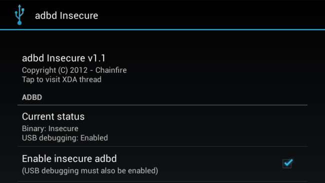 adb sẽ cần quyền truy cập root để bạn thực hiện việc này - nếu bạn đang sử dụng ROM tùy chỉnh, bạn có thể đã có một adb có quyền truy cập root. Nếu bạn đang sử dụng ROM gốc, bạn sẽ cần một cái gì đó như adbd Insecure để thực hiện việc này. Bạn có thể tải xuống adb Insecure từ Google Play hoặc là miễn phí trên diễn đàn Nhà phát triển XDA . Sử dụng ứng dụng để đặt adbd ở chế độ không an toàn.