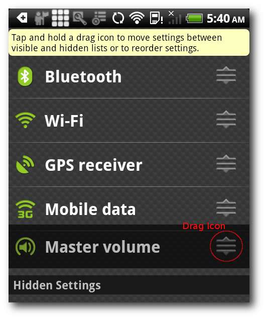 Nhấn giữ “Biểu tượng kéo” để sắp xếp lại mục cài đặt hệ thống mà chúng ta muốn xem trong màn hình chính Cài đặt nhanh.