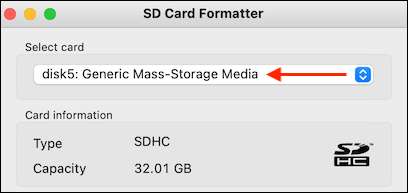 Quay lại ứng dụng Formatter SD, thẻ SD sẽ hiển thị trong phần "Thẻ đã chọn". Bạn cũng sẽ thấy chi tiết về thẻ SD, chẳng hạn như loại và dung lượng thẻ SD.