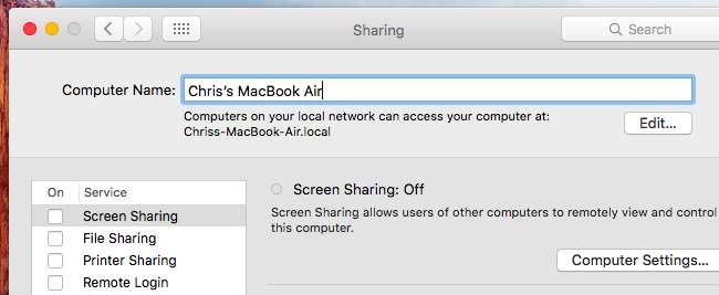 Trên máy Mac, tùy chọn này nằm trong cửa sổ System Preferences. Để truy cập nó, hãy nhấp vào menu Apple trên thanh menu ở đầu màn hình của bạn và chọn “System Preferences”. Nhấn vào " Chia sẻ ”Trong cửa sổ tùy chọn hệ thống và nhập tên mới cho máy Mac của bạn trong trường“ Tên máy tính ”ở đầu cửa sổ.