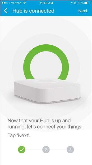 Chờ trung tâm khởi động và bạn sẽ sớm thấy ba đèn LED nhỏ xuất hiện ở mặt trước. Nhấn “Tiếp theo” trong ứng dụng khi bạn nhìn thấy những ánh sáng này.