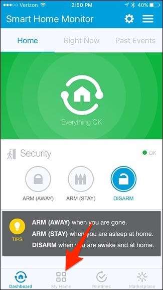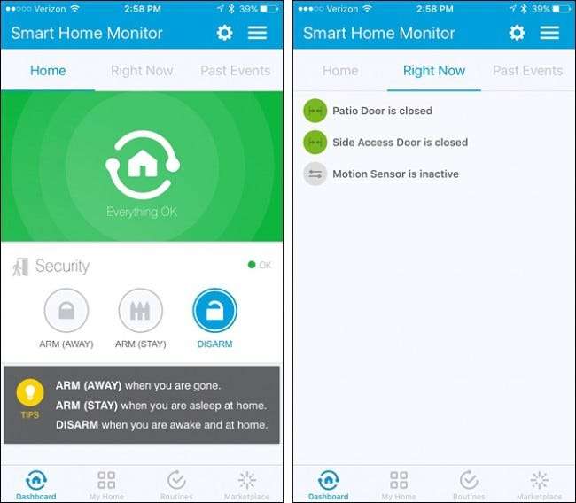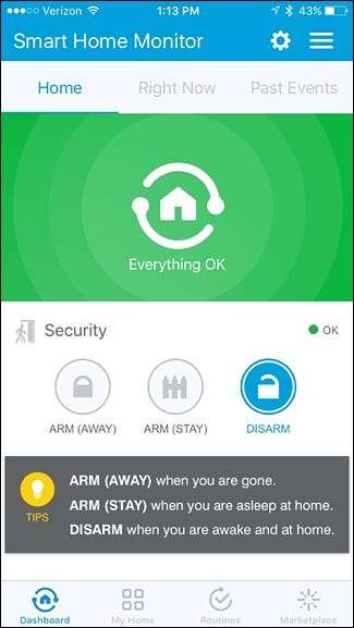 Sau khi thiết lập tất cả các cảm biến và thiết bị của mình, bạn có thể bắt đầu giám sát và trang bị cho ngôi nhà của mình bất kỳ lúc nào. Từ màn hình chính, bạn có thể nhanh chóng thay đổi trạng thái ngôi nhà của mình, vì vậy, khi ngôi nhà của bạn được "trang bị", bạn sẽ nhận được thông báo khi có bất kỳ điều gì xảy ra. Khi nó bị giải trừ, bạn sẽ không nhận được bất kỳ thông báo nào.