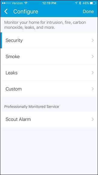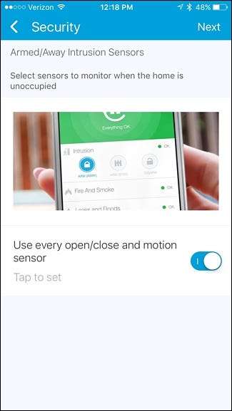 Theo mặc định, tất cả các cảm biến của bạn sẽ được trang bị vũ khí để giám sát ngôi nhà của bạn, nhưng bạn có thể tắt công tắc bật tắt và chọn các cảm biến cụ thể. Nhấn “Tiếp theo” khi bạn hoàn tất.