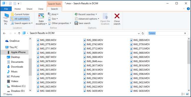 Bạn không muốn lướt qua từng thư mục một và cố gắng tìm tệp MOV, vì vậy, việc tìm kiếm chúng dễ dàng hơn bằng cách sử dụng chuỗi tìm kiếm “* .mov”. Thao tác này sẽ hiển thị cho bạn tất cả các tệp trên thiết bị của bạn có đuôi .mov.