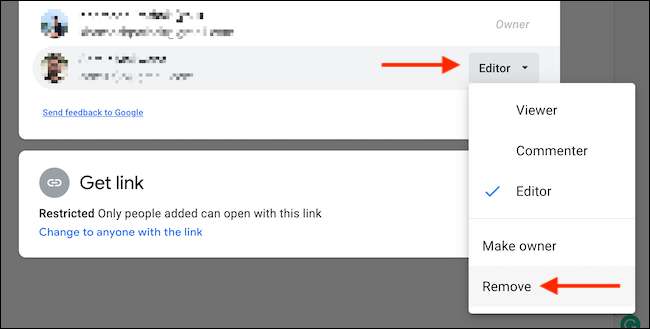 Trong phần trên cùng, bạn sẽ thấy tất cả những người dùng có quyền truy cập vào tài liệu và vai trò của họ. Nhấp vào danh sách thả xuống "Vai trò" và chọn nút "Xóa" để xóa người dùng. Họ sẽ không còn có quyền truy cập vào tập tin hoặc thư mục.