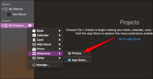 Để tạo trình chiếu trong Ảnh, hãy mở ứng dụng, chọn biểu tượng “+” bên cạnh “Dự án của tôi”, di chuột qua “Trình chiếu” trong menu, sau đó chọn ứng dụng “Ảnh”.