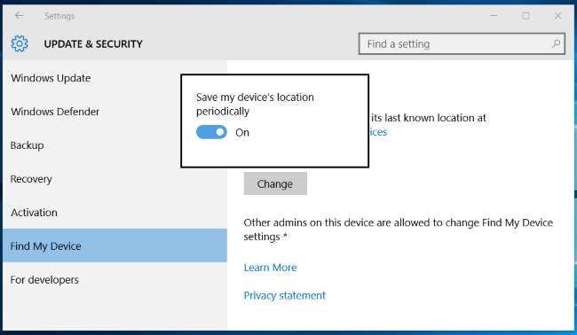 Kích hoạt tùy chọn “Lưu vị trí thiết bị của tôi theo định kỳ” khi được nhắc và PC chạy Windows 10 của bạn sẽ thường xuyên và tự động gửi vị trí của nó cho Microsoft. Điều này sẽ cho phép bạn xác định vị trí PC của mình ngay cả khi nó không được bật nguồn và trực tuyến khi bạn theo dõi nó, vì bạn có thể xem vị trí đã biết gần đây nhất.