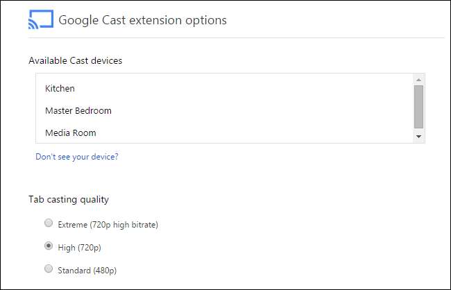 Mặc dù nó không nhất thiết làm cho trải nghiệm truyền của bạn đẹp hơn bất kỳ nhưng nếu bạn đã cố gắng hết sức để loại trừ các sự cố Wi-Fi và bạn vẫn gặp sự cố với truyền tab, thì tùy chọn tốt nhất là đi vào các tùy chọn cho tiện ích mở rộng của Chrome và điều chỉnh chất lượng video. Bằng cách nhấp chuột phải vào tiện ích mở rộng Chromecast trong Chrome và chọn các tùy chọn bạn có thể truy cập menu này (lưu ý: liên kết trực tiếp trước chỉ hoạt động nếu bạn đang sử dụng Chrome có cài đặt tiện ích mở rộng Chromecast).