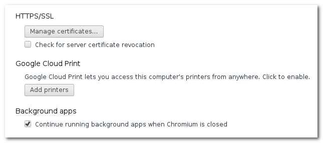 Sau khi khởi chạy Chromium, hãy điều hướng đến biểu tượng menu ở góc trên bên phải, nhấp vào biểu tượng đó rồi chọn “Cài đặt”. Cuộn xuống trong cửa sổ Cài đặt cho đến khi bạn thấy “Cài đặt nâng cao” và sau khi nhấp vào đó, tiếp tục cuộn xuống qua các tùy chọn cài đặt mở rộng cho đến khi bạn thấy mục nhập cho Google Cloud Print: