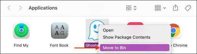 Điều này sẽ mở trình tìm kiếm với ứng dụng được chọn. Nhấp chuột phải vào ứng dụng và chọn nút "Di chuyển đến Bin" (hoặc "Di chuyển đến Thùng rác").