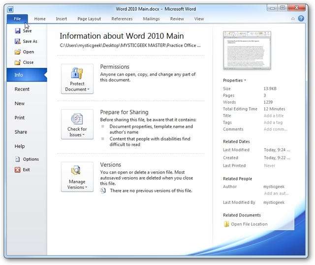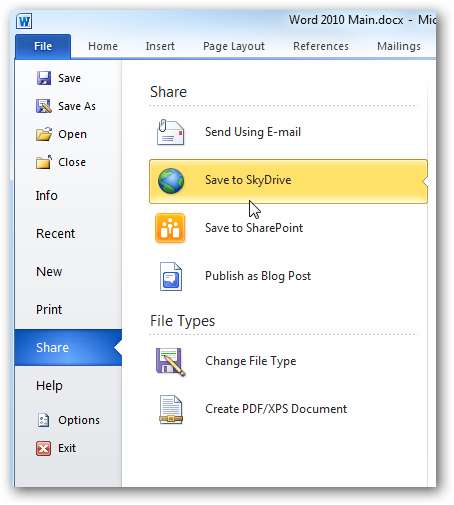 Mở tài liệu bạn muốn tải lên Ứng dụng web trong Windows Live và nhấp vào tab Tệp để mở Dạng xem hậu trường. Trong ví dụ này, chúng tôi sẽ tải tài liệu Word lên Windows Live SkyDrive.