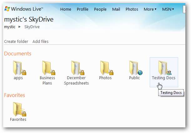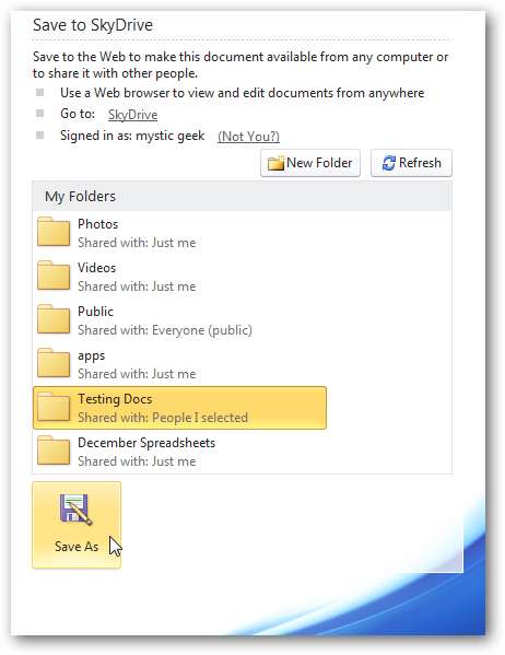 Sau khi bạn đăng nhập, danh sách các thư mục trong SkyDrive của bạn sẽ được hiển thị. Đánh dấu thư mục bạn muốn lưu tài liệu và nhấp vào nút “Lưu dưới dạng”. Trong ví dụ này, chúng tôi đang lưu tài liệu Word này trong thư mục “Kiểm tra tài liệu” trong SkyDrive của chúng tôi.