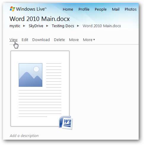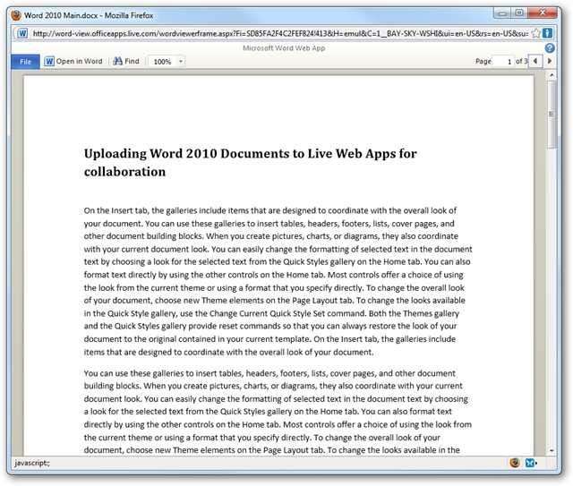 Đây là cách xem tài liệu trong màn hình bật ra trong Firefox. Kể từ lúc viết bài này, các Ứng dụng Web của Office vẫn đang ở trong Bản xem trước Kỹ thuật và không có bất kỳ chức năng chỉnh sửa nào dành cho tài liệu Word, chỉ có thể xem và tải xuống.