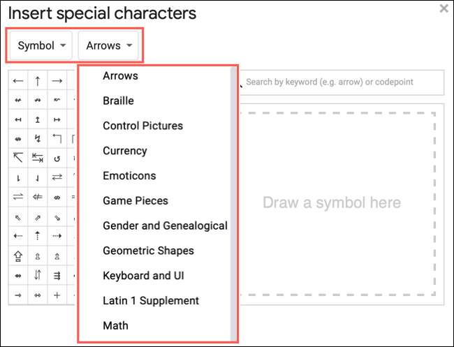 Cùng với các biểu tượng cơ bản, bạn có thể chọn từ biểu tượng cảm xúc. , dấu câu và các kịch bản khác nhau. Trong danh sách thả xuống Biểu tượng, chọn một trong các tùy chọn này, sau đó chọn một danh mục trong danh sách thả xuống thứ hai.