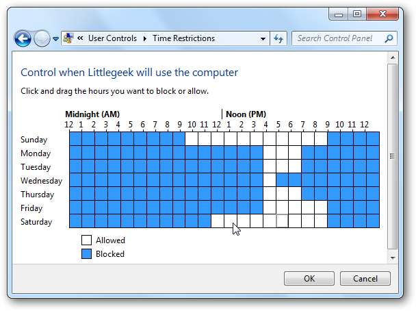 Nhấp vào Giới hạn thời gian để kiểm soát thời điểm con bạn truy cập vào máy tính. Nếu bạn chỉ muốn cho phép một vài giờ mỗi ngày, cách dễ nhất là nhấp chuột trái và kéo chuột qua tất cả các khe thời gian để chặn chúng. Sau đó, cho phép các khối thời gian khi bạn muốn cung cấp máy tính.