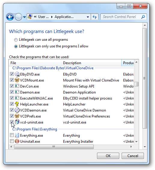 Nếu bạn muốn hạn chế một số chương trình trên máy, hãy nhấp vào Cho phép và chặn các chương trình được chỉ định sau đó cuộn qua danh sách các chương trình đã cài đặt và chặn chúng.