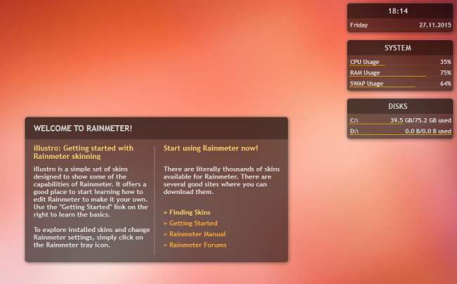 Sau khi cài đặt Rainmeter, bạn sẽ thấy một số thứ mới trên màn hình của mình, hiển thị những thứ cơ bản như sử dụng đĩa và CPU. Đây là giao diện mặc định của Rainmeter.