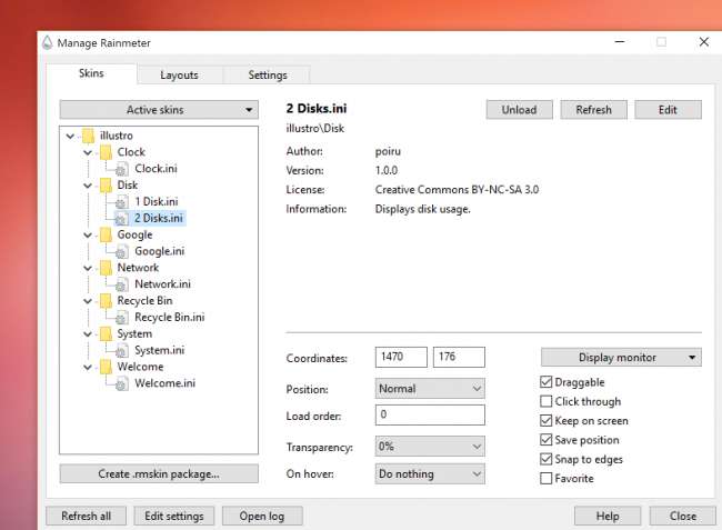 Bạn có thể chỉnh sửa vị trí và cài đặt của từng da. Nếu bạn muốn không kéo được, hãy bỏ nhấp vào “Có thể kéo” và nhấp vào “Nhấp qua”. Thao tác này cũng sẽ vô hiệu hóa menu nhấp chuột phải, nhưng may mắn thay Rainmeter thêm một biểu tượng trên thanh công cụ Windows, biểu tượng này cũng cho phép bạn truy cập menu.