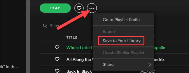 Tiếp theo, danh sách phát phải được thêm vào thư viện của bạn. Nhấn vào biểu tượng menu ba chấm và chọn "Lưu vào thư viện của bạn."