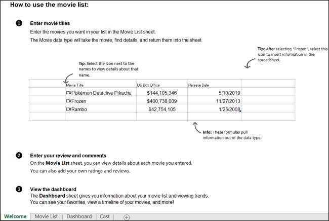 Khi bạn tải xuống một mẫu và mở nó trong Microsoft Excel, nó đã sẵn sàng để sử dụng ngay từ đầu. Tuy nhiên, tab "Chào mừng" cung cấp cho bạn một bản tóm tắt một cách hữu ích, ngắn và ngọt về cách sử dụng mẫu cụ thể đó. Mỗi mẫu hơi khác một chút so với những mẫu khác, nhưng tất cả đều bắt đầu với bạn vào một từ khóa hoặc cụm từ.