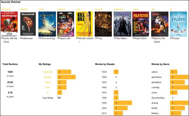Bảng điều khiển hiển thị các bộ phim mà bạn thêm vào danh sách dưới dạng hình ảnh poster phim và bao gồm xếp hạng cũng như phim theo thập kỷ và thể loại.