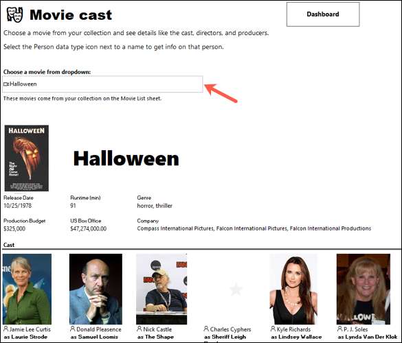 Tab Cast có một hộp thả xuống ở trên cùng mà điền vào các bộ phim mà bạn thêm vào danh sách của mình. Chọn một bộ phim từ ô này và bạn sẽ thấy bộ phim của bộ phim, giám đốc (s) và nhà sản xuất (s).