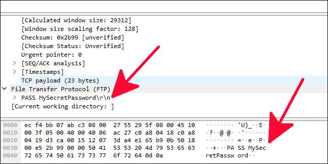 Để làm rõ lý do tại sao bạn không bao giờ muốn sử dụng FTP qua Internet, hãy xem ảnh chụp màn hình bên dưới. Nó hiển thị mật khẩu FTP ở dạng bản rõ. Bất kỳ ai trong mạng của bạn hoặc giữa bạn và máy chủ FTP trên Internet đều có thể dễ dàng thấy mật khẩu là “MySecretPassword”.