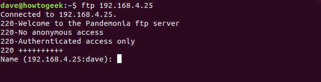 Lưu ý rằng địa chỉ IP của trang web bạn đang kết nối được hiển thị, theo sau là tên người dùng Linux của bạn. Nếu tên tài khoản của bạn trên máy chủ FTP giống với tên người dùng Linux của bạn, chỉ cần nhấn phím Enter. Điều này sẽ sử dụng tên người dùng Linux của bạn làm tên tài khoản trên máy chủ FTP. Nếu tên người dùng Linux của bạn và tên tài khoản FTP khác nhau, hãy nhập tên người dùng tài khoản FTP rồi nhấn Enter.