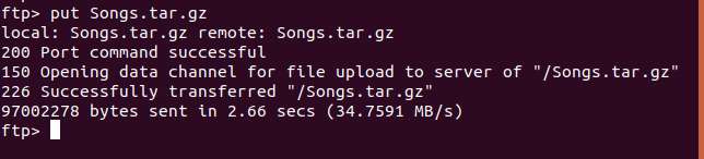 Máy chủ FTP phản hồi bằng cách chuyển tệp sang máy tính cục bộ và xác nhận quá trình chuyển đã diễn ra. Kích thước của tệp và thời gian cần để chuyển cũng được hiển thị.