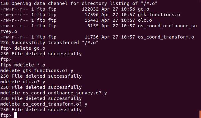 Tại đây người dùng FTP của chúng tôi đã liệt kê các tệp để xem tên của chúng và sau đó chọn một tệp để xóa. Sau đó họ quyết định xóa tất cả.
