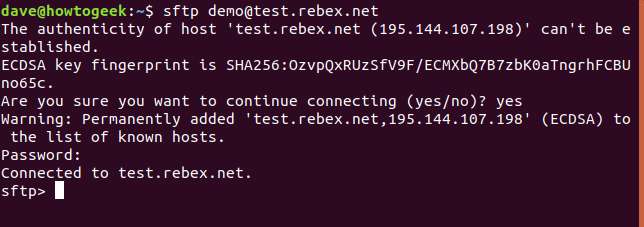 Khi họ kết nối, họ được thông báo rằng kết nối đã được thiết lập. Họ cũng được thông báo rằng không thể xác minh tính xác thực của máy chủ. Điều này là bình thường đối với kết nối đầu tiên một máy chủ mới. Họ nhấn “y” để chấp nhận kết nối.