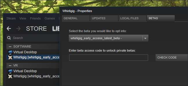 Sau đó, nhấp chuột phải vào Whirligig trong thanh bên của Steam và chuyển đến Thuộc tính. Nhấp vào tab “Betas” và chọn tham gia bản beta mới nhất trong menu thả xuống. Whirligig sẽ cập nhật lên phiên bản mới nhất có thể.