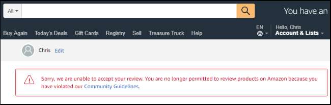 Vào tháng 10 năm 2018, tôi đã nhấp vào Amazon.com và nhận thấy nó đã cấm tôi để lại các bài đánh giá. Khi tôi nhấp vào nút “Viết đánh giá”, tôi thấy một thông báo cho biết tôi không thể đánh giá sản phẩm. Như Amazon đã nói:
