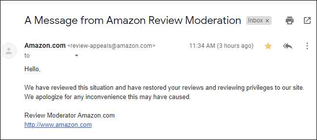 Tôi đã bị xoay quanh một số phòng ban trước khi kết thúc với một “chuyên gia” đã gửi một số thông tin đến “Nhóm đánh giá” của Amazon. Hai ngày sau, tôi nhận được email thông báo rằng tôi không còn bị cấm nữa và bài đánh giá của tôi đã được khôi phục: