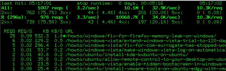 Vì tất cả các bài viết của tôi đều nằm trong thư mục con / how to /, tôi sẽ nhập nó vào. Bây giờ apachetop sẽ chỉ hiển thị các lượt truy cập liên quan đến lượt truy cập vào các bài báo, thay vì mọi lượt truy cập cho mọi hình ảnh.