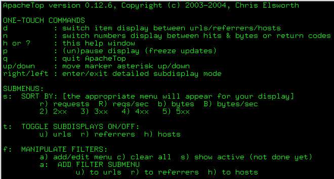 apachetop -H hits (Sẽ hiển thị số liệu thống kê về x số lần truy cập cuối cùng)