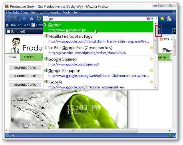 Bạn có thể bắt đầu sử dụng tiện ích mở rộng ngay sau khi bạn đã cài đặt nó… chỉ cần truy cập các liên kết yêu thích của bạn trong “Menu Dấu trang, Thanh công cụ dấu trang, Thanh tuyệt vời hoặc Menu lịch sử” và nhấp chuột giữa vào các mục nhập thích hợp. Tại đây, bạn có thể thấy trình duyệt của chúng tôi đang mở trang web Productive Geek và “Menu Dấu trang” vẫn đang mở. Ngay sau khi bạn nhấp chuột trái vào một liên kết hoặc nhấp vào bên ngoài menu, chúng sẽ đóng lại bình thường như trước.