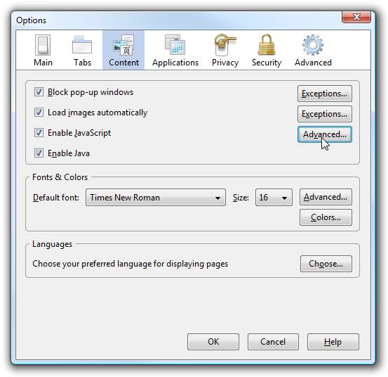 Mở bảng Công cụ \ Tùy chọn, rồi chuyển đến "tab" Nội dung ở trên cùng. Bạn sẽ thấy ba nút ở phía bên phải, hãy chọn một nút có nội dung “Nâng cao”.