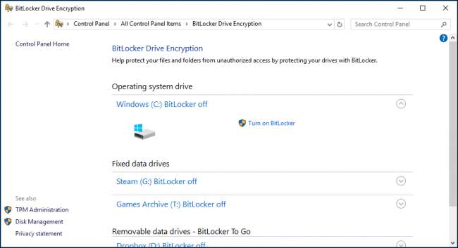 Nếu BitLocker bị tắt, thì sẽ có một liên kết cho biết “Bật Bitlocker” bên cạnh (các) ổ đĩa của bạn. Ít nhất, bạn muốn mã hóa ổ đĩa hệ thống của mình, thường là ổ C: trên hầu hết các máy tính Windows. Nếu bạn đang sử dụng máy tính xách tay, thì rất có thể bạn chỉ có một ổ cứng để lo lắng.