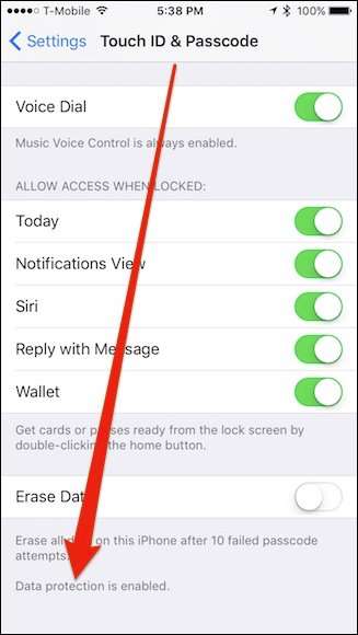 Nếu bạn muốn xác minh đầy đủ rằng thiết bị của mình đã được mã hóa, hãy cuộn xuống cuối cài đặt Touch & Passcode và kiểm tra xem nó có thông báo “Đã bật bảo vệ dữ liệu” hay không.