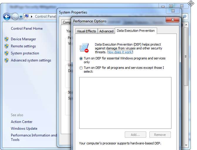 EMET cung cấp một cách để bật DEP, ASLR, cũng như các tính năng bảo mật khác cho các ứng dụng không yêu cầu chúng một cách cụ thể. Đây không phải là một tính năng Windows đi kèm vì nó có khả năng làm hỏng một số chương trình và hầu hết người dùng Windows sẽ không biết cách khắc phục các sự cố như vậy.