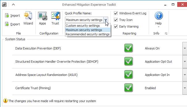 EMET cho phép bạn tự kích hoạt nhiều tính năng bảo mật hơn. Ví dụ: bạn có thể nhấp vào hộp Tên hồ sơ nhanh và chọn Cài đặt bảo mật tối đa. Điều này sẽ bật DEP cho tất cả các ứng dụng và bật Bảo vệ ghi đè trình xử lý ngoại lệ có cấu trúc (SEHOP) cho các ứng dụng không chọn không tham gia cụ thể.
