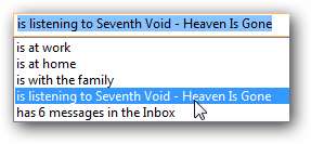 Giờ đây, bạn có thể thay đổi trạng thái của mình bằng cách viết theo suy nghĩ tùy chỉnh của riêng bạn hoặc chọn từ một số thông báo được định cấu hình trước từ hộp thả xuống. Nếu bạn đang phát nhạc trong WMP hoặc iTunes, sẽ có một lựa chọn cho nhạc.
